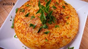 Numa frigideira pequena antiaderente de cerca de 20 cm de diâmetro – tipo a omeleteira (e se for a omeleteira, melhor ainda!) -, regue com o azeite e disponha uma camada de batata ralada, coloque o recheio, e cubra com mais batata ralada.