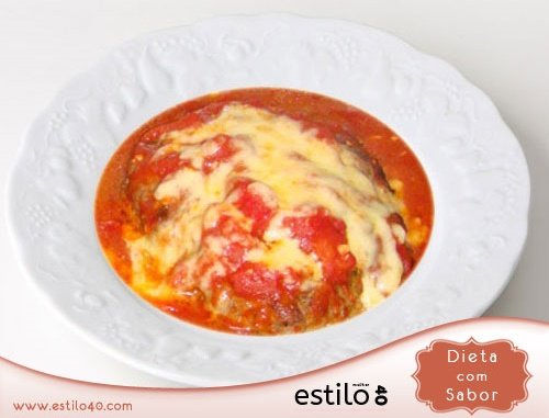 Leve a um refratário e prepare o molho – o molho de tomate caseiro é fácil: risque levemente um ‘x’ na base dos tomates e leve para ferver por uns dois minutos; retire-os e coloque numa vasilha com água fria, para dar o choque térmico: a casca sai facilmente. Pique os tomates a grosso modo e refogue com alho, cebola e um fio de óleo. Coloque um pouquinho de água fervente, acerte o sal (bem pouquinho), deixe engrossar e coloque por cima do seu polpetone; salpique queijo ralado – nesse, do jantar de ontem, usei mussarela ralada – e leve ao forno por uns minutinhos, para dourar.