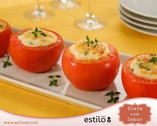 Amasse a ricota e tempere com alho bem picadinho, salsinha, cebolinha, azeite, requeijão light, sal – e opcional, nozes ou castanhas picadas (não precisa, mas se você tiver à mão, fica muito gostoso). Misture bem e recheie os tomates um a um; coloque num refratário ou assadeira levemente untado. Polvilhe um pouco de queijo ralado em cada um, e coloque no forno médio para gratinar. Quando o queijo estiver dourado, está na hora de servir.