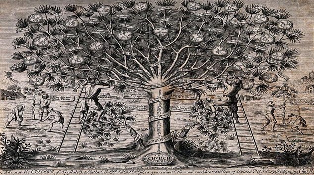 Antiga gravura inglesa mostra árvore que representa a igreja católica (fonte: Wikicommns).